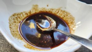 Това е основното. Сега следва глазурата. Десет минути преди края на печенето премахваме напълно фолиото и после връщаме за допичане. Около 5 минути, време достатъчно да си разбъркаме съставките на глазурата в подходяща купичка.
