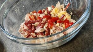 Най-напред започваме с месото. Слагаме го да се вари, а след него в отделен съд и яйцата. През това време можем да си изпечем чушката (или от буркан), да нарежем луканката, чери доматите и да подготвим подправките. След като месото и яйцата са готови, вземаме подходяща дълбока купа и започваме да сглобяваме салатата.