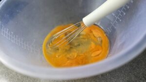 Започваме, като в дълбока купа чукваме яйцата, прибавяме захарта (и ваниловата също) и солта. Разбиваме всичко с домакинска тел, да се стопи захарта.