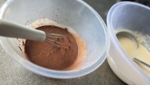 Следва да сипем прясното мляко. Добре е да бъде със стайна температура. Разбъркваме добре и започваме да прибавяме поетапно ( на два-три пъти) и брашното. Бъркаме старателно, за да не остават бучки. Трябва да получим гладка еднородна смес. Накрая добавяме и разтопеното масло. Щом сме готови, вземаме втора по-малка купа и сипваме в нея един черпак от сместа. Прибавяме лъжица какао и разбъркваме. Добавяме и още 2 черпака от основната смес.
