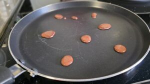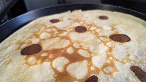 Вече сме готови да започваме с изпичането на палачинките. Върху загрятия тиган за палачинки, най-напред сипваме (с помоща на чаена лъжица) от сместа с какаото.