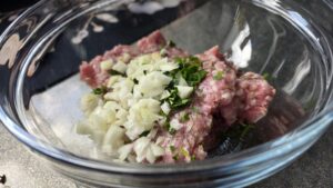 Започваме с приготвянето на каймата. Слагаме я в подходящ съд, добавяме солта, лука и останалите подправки и добре я омесваме.