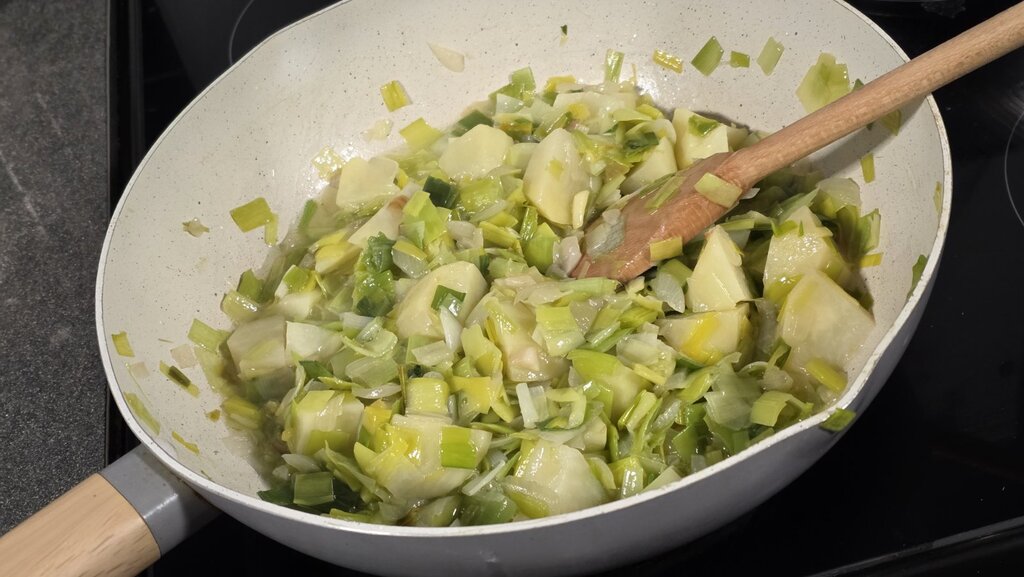 Най-напред нарязваме свинското на средни парчета и го слагаме да се вари. През това време нарязваме лука и праза и ги сипваме в тиган с малко загрято олио да се позадушат. След 5-6 минути добавяме и нарязаните на средни кубчета картофи. Запържваме още около 5-6 минути, като усърдно разбъркваме.