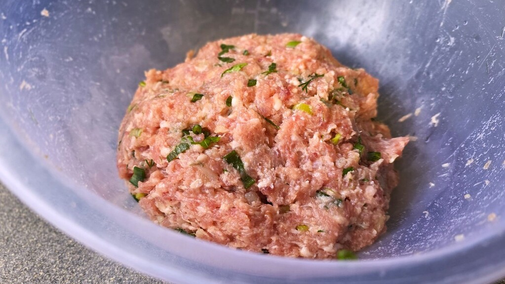 Започваме, разбира се с омесването на каймата. В подходяща купа слагаме каймата, лука и галетата. В друга, разбиваме яйцето със солта. Добавяме също водата и подправките. За да се омеси по-добре каймата, а и да стане по-мазна, можем да добавим 1 с.л. зехтин или олио. Разбъркваме добре течните съставки и ги сипваме при месото. Следва да запретнем ръкави и да омесим добре каймата.