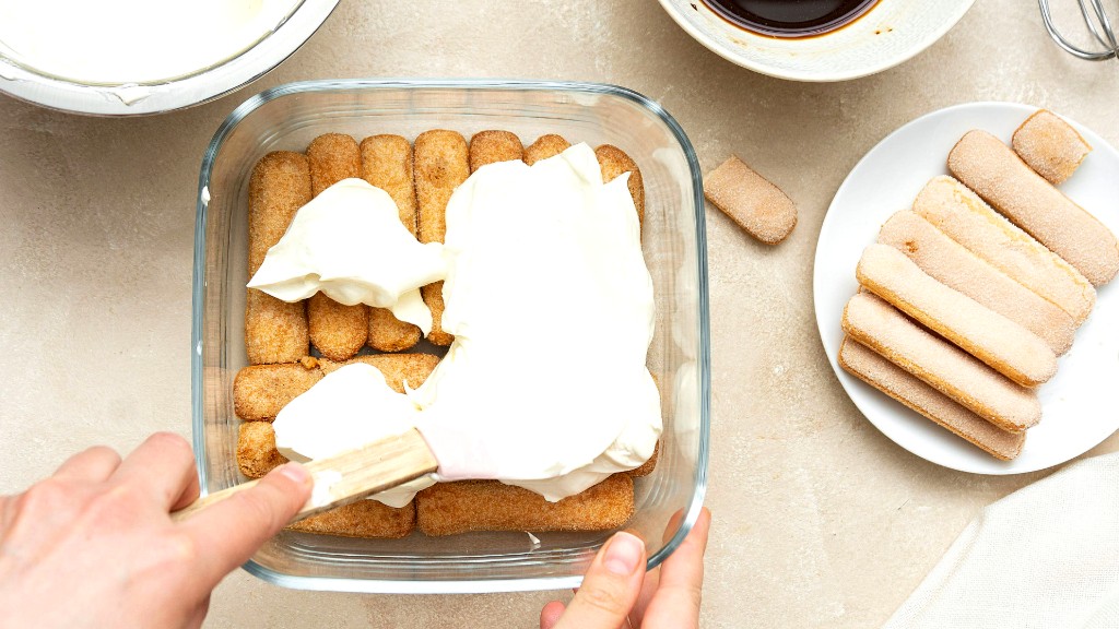На дъното на тавичка започваме да нареждаме слой бишкоти. Потапяме всяка бишкота в кафето за по 1-2 секунди от всяка страна и я поставяме в тавичката. Нанасяме половината от крема отгоре. Повтаряме с втори слой бишкоти и завършваме с останалия крем. Покриваме със стреч фолио и оставяме в хладилник за поне 5-6 часа (най-добре за цяла нощ), за да стегне и вкусовете да се смесят.