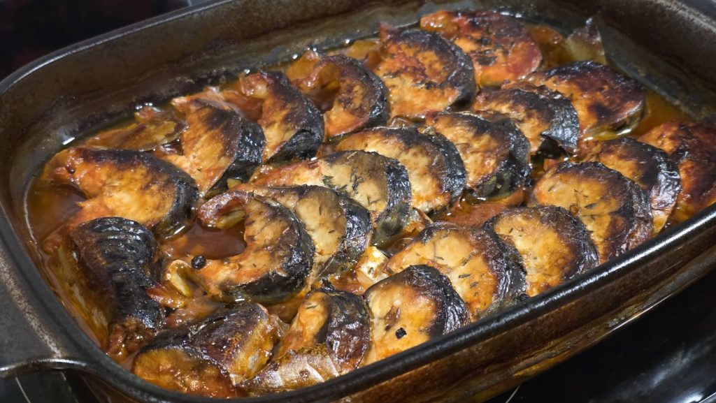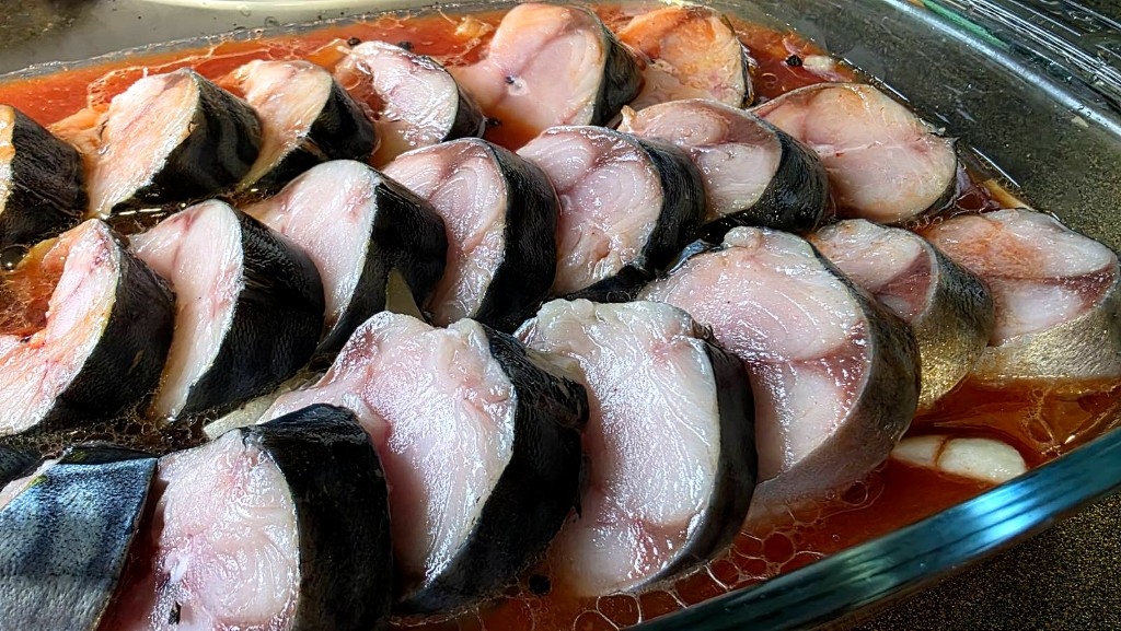 Започваме с почистването, измиването и нарязването на рибата. За настоящата рецепта, нарязваме рибата на шайби.