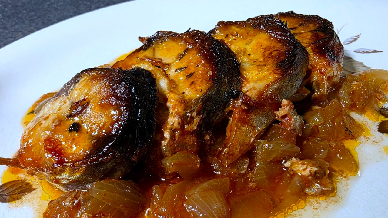 Скумрия с лук и доматен сос на фурна. Рибата става сочна, а сосът допълнен с малко червено вино – богат на аромати. Продукти и основни стъпки по приготвянето. Да започваме.
