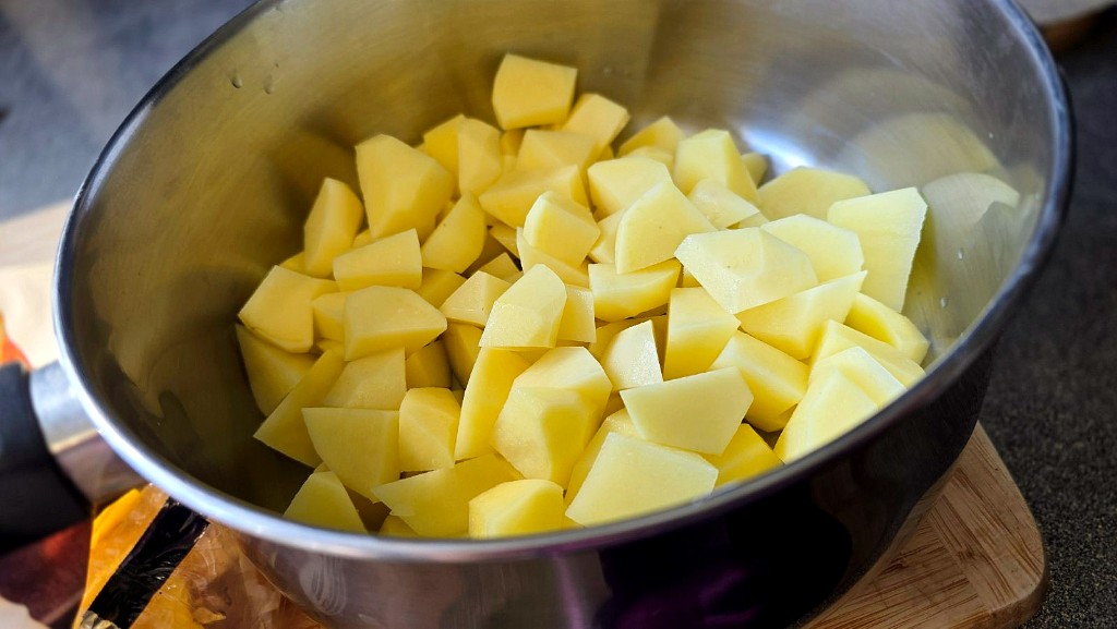 Започваме с картофите, които обелваме, измиваме и нарязваме на средни по големина парчета.