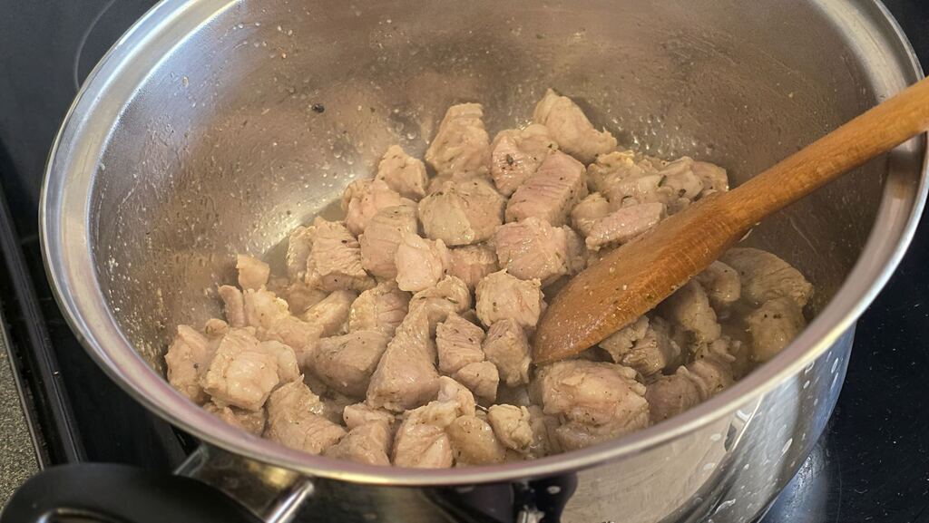 Слагаме ги да се варят, като много внимаваме да не се преварят. Добре е да ги изкараме малко преди готовност. През това време нарязваме месото, със същата големина и го слагаме да се позадуши за десетина минути.