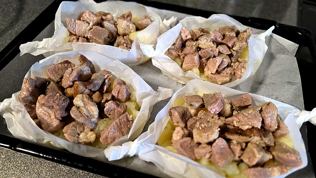 Когато всичко е готово, оформяме лодки от хартия за печене и ги подреждаме в подходяща тава. Тавата също застиламе предварително с хартия. Разпределяме в лодките картофите, а после и месото.